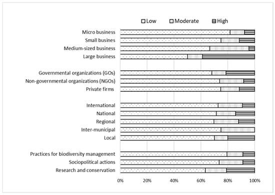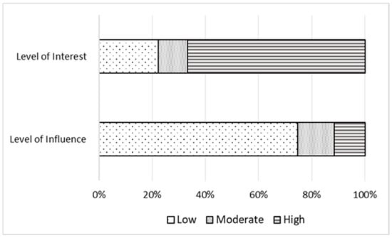 In addition, we sought to identify the profile of stakeholders with greater interest and influence in the management of these territories. Figure 3 compares the level of interest by stakeholders’ profiles, revealing that a high level of interest is relatively independent of the profile. Nevertheless, some differences among stakeholders can be identified. For instance, large companies register higher levels of interest (88.9%), with a limited percentage of respondents reporting low interest (11.1%), whereas micro companies state lower levels of interest (60.6% high and 27.3% low). Likewise, GOs revealed a larger difference between low (14.9%) and higher (78.75) levels of interest, especially compared to NGOs and private firms.