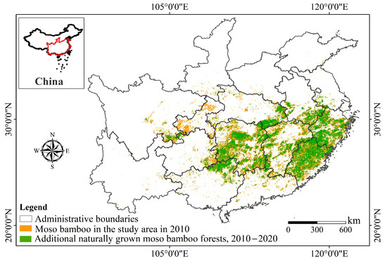 Distribution of moso bamboo in the study area in 2010 and additional naturally grown moso bamboo forests from 2010 to 2020.