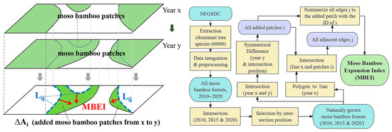 Native moso bamboo expansion or invasion has been confirmed in most protected areas or multiple sample plots in experimental studies. To measure the expansion of moso bamboo forest patches across a larger area, we sought to define an expansion index to evaluate the average expansion level of these patches. In a planar view, each newly formed moso bamboo patch can be considered an irregular figure. The average height of such an irregular figure is calculated by dividing its total area by its base [40]. For moso bamboo patches, this base is defined as the contact boundary between the years before and after the bamboo expansion, and the average height reflects the extent of the new patch’s expansion. Additionally, since an added patch may expand from various directions and positions, the base of the expanding patch should consider the total length of all contact edges in the calculation process. Accordingly, we developed a formula for deriving the Moso Bamboo Expansion Index (MBEI), which represents the annual average expansion rate of each bamboo patch from the xth to the yth year.