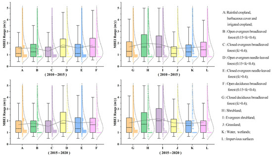 denotes enhance_bi. (A: rainfed cropland, herbaceous cover, and irrigated cropland; B: open evergreen broadleaved forest (0.15 < fc < 0.4); C: closed evergreen broadleaved forest (fc > 0.4); D: open evergreen needle-leaved forest (0.15 < fc < 0.4); E: closed evergreen needle-leaved forest (fc > 0.4); F: open deciduous broadleaved forest (0.15 < fc < 0.4); G: closed deciduous broadleaved forest (fc > 0.4); H: shrubland; I: evergreen shrubland; J: grassland; K: water, wetlands; and L: impervious surfaces.).