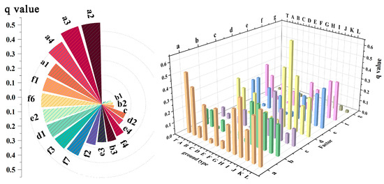 On the left, the circular bar chart illustrates the contribution values (q values) of individual factors for the bamboo area. The calculation process adopts a t-test with a significance level of 0.05, The p-values for all factors are < 0.05. Indicators with very low contribution rates are not labeled in the figure, as they are sorted from highest to lowest contribution rate.(a1: ≥10 °C accumulated temperature; a2: annual mean temperature; a3: annual mean minimum temperature; a4: annual mean maximum temperature; b1: annual precipitation; b2: relative humidity; b3: potential mean evapotranspiration; c: near-surface wind speed; d1: surface solar radiation; d2: sunshine duration; e1: dominant soil unit; e2: texture class; e3: reference bulk density; e4: AWC for rootable soil depth; f1: organic carbon content; f2: total nitrogen content; f3: total phosphorus content; f4: total potassium content; f5: pH in water; f6: case saturation as the percentage of CECsoil; f7: cation exchange capacity of the soil; g1: elevation; and g2: slope). On the right, the 3D histogram shows the average contribution rate q values of the seven major factors for the expansion of bamboo into different habitats. (T: all expansion areas of moso bamboo; A: rainfed cropland, herbaceous cover, and irrigated cropland; B: open evergreen broadleaved forest (0.15 < fc < 0.4); C: closed evergreen broadleaved forest (fc > 0.4); D: open evergreen needle-leaved forest (0.15 < fc < 0.4); E: closed evergreen needle-leaved forest (fc > 0.4); F: open deciduous broadleaved forest (0.15 < fc < 0.4); G: closed deciduous broadleaved forest (fc > 0.4); H: shrubland; I: evergreen shrubland; J: grassland; K: water, wetlands; L: impervious surfaces. a: temperature; b: moisture; c: atmosphere; d: light; e: physical properties of soil; f: chemical properties of soil; and g: terrain).
