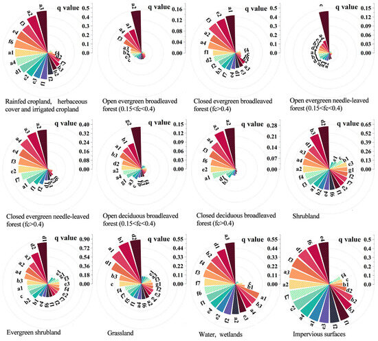 The circular bar chart shows the q values of the driving factors for the expansion of bamboo into 12 different habitats. The calculation process adopts a t-test with a significance level of 0.05. Except for f5 in type open evergreen broadleaved forests (0.15 < fc < 0.4) and e2 in type open evergreen needle-leaved forests (0.15 < fc < 0.4), the p-values of others are <0.05. Indicators with very low contribution rates are not labeled in the figure, as they are sorted from highest to lowest contribution rate. (a1: ≥10 °C accumulated temperature; a2: annual mean temperature; a3: annual mean minimum temperature; a4: annual mean maximum temperature; b1: annual precipitation; b2: relative humidity; b3: potential mean evapotranspiration; c: near-surface wind speed; d1: surface solar radiation; d2: sunshine duration; e1: dominant soil unit; e2: texture class; e3: reference bulk density; e4: AWC for rootable soil depth; f1: organic carbon content; f2: total nitrogen content; f3: total phosphorus content; f4: total potassium content; f5: pH in water; f6: base saturation as the percentage of CECsoil; f7: cation exchange capacity of the soil; g1: elevation; and g2: slope).