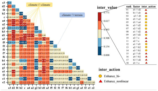 Additionally, factors with a higher inter_value in interaction detectors are also of a higher q_value in single-factor testing. However, some factors with weaker power in single-factor testing may gain significant importance when interacting with others. In single-factor testing, the importance of terrain to MBEI is lower than other variables, yet its interaction with surface solar radiation (d1) also reaches 0.631 (Figure 6).