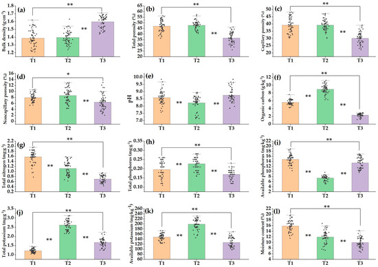 Basic physical and chemical properties of soils with different surface cover types. T1—Turf surface cover (TC), T2—partially impervious cover (PIC), T3—totally impervious cover (TIC). (a) bulk density, (b) total porosity, (c) capillary porosity, (d) non-capillary porosity, (e) pH, (f) soil organic carbon, (g) total nitrogen content, (h) the content of total phosphorus, (i) available phosphorus content, (j) total potassium content, (k) available potassium, (l) soil moisture content. “*” means that the two gradients have reached a significant level, and “**” means that the two gradients have reached a very significant level.