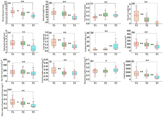 Plant functional traits under different types of hardened surface. (a) Branch diameter, (b) branch length, (c) leaf thickness, (d) branch weight, (e) internode length, (f) leaf dry weight, (g) leafing intensity, (h) leaf area, (i) specific leaf area, (j) leaf dry matter content, (k) branch dry matter content, (l) total leaf area, (m) mass ratio of branches and leaves. T1—Turf surface cover (TC), T2—partially impervious cover (PIC), T3—totally impervious cover (TIC). “*” means that the two gradients have reached a significant level, and “**” means that the two gradients have reached a very significant level.