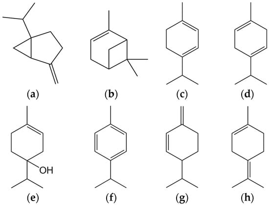 Chemical structures of the major constituents of the leaf essential oil: (a) sabinene; (b) α-pinene; (c) α-terpinene; (d) γ-terpinene; (e) terpinen-4-ol; (f) p-cymene; (g) β-phellandrene; (h) terpinolene.