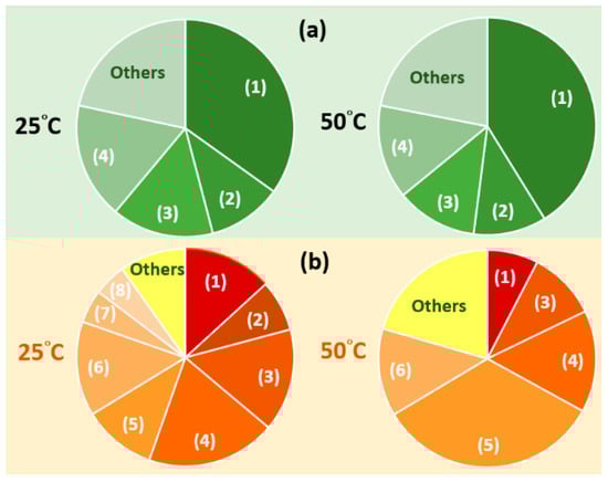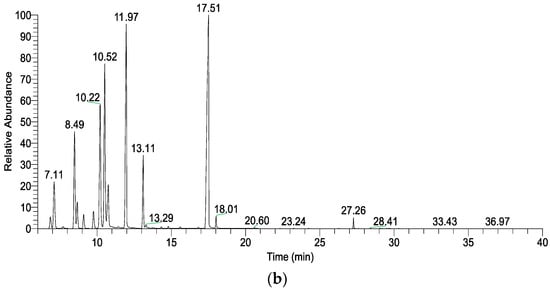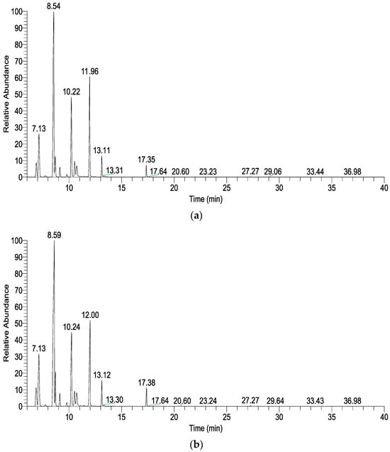 Gas chromatograms of the VOCs from L. formosana leaf essential oils at different temperatures: (a) 25 °C; (b) 50 °C.