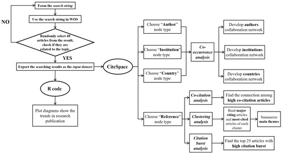 The computer programming language R was only used to study the trends in research publications. Meanwhile, the main visualization tool used in this study is the CiteSpace software. Compared to other bibliometric analysis tools, CiteSpace has some unique advantages. Its integration of temporal analysis, citation burst detection, and sophisticated network metrics with advanced visualization capabilities make it particularly effective for identifying emerging trends and mapping the evolution of scientific fields [9,10]. These strengths enable CiteSpace to provide a more comprehensive and integrated bibliometric analysis than other visualization tools like VOSviewer, CoPalRed, Sci2, and so on [10,11,12]. In this study, we mainly used the functions provided by CiteSpace software to conduct the following analysis: