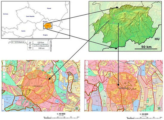 Location of experimental areas (on the left is the area of Budča in the Kremnica Mountains—the area with tannin licks; on the right is the control (untreated) area of Makovisko in the Javorie Mountains).