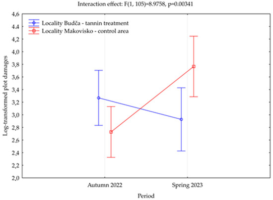 The ANOVA showed that individual factors do not significantly impact the mean plot damage area, but their interaction does. To further analyze this, multiple non-parametric comparisons of significant interactions were subsequently performed (Table 4). Here, the combination of “Makovisko” with “Spring” is significantly different from the combination of “Makovisko” with “Autumn”. Other interactions did not distinguish significantly and can be assessed as comparable.