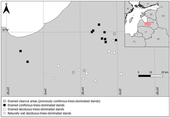 The two-year long study was initiated in 2020 and conducted in 26 sites in hemiboreal forests (23 sites in forest stands and 3 sites in clearcut areas) with drained and naturally wet organic soils in Latvia (Figure 1). According to Latvia’s national forest site type classification system [43], study sites with drained organic soils corresponded to Myrtillosa turf. mel. and Oxalidosa turf. mel. forest site types, while study sites with naturally wet organic soils corresponded to Dryopterioso-caricosa and Filipendulosa forest site types. Thus, organic soils in all study sites corresponded to nutrient-rich status [43,44]. Study sites in forest stands with drained organic soils were dominated by both coniferous tree species (Norway spruce Picea abies (L.) H. Karst.) and deciduous tree species (silver birch Betula pendula Roth and black alder Alnus glutinosa (L.) Gaertn), while study sites in forest stands with naturally wet organic soils were dominated only by deciduous tree species (Table 1). A general description of the composition of understory vegetation in forest stands with drained and naturally wet organic soils is provided in Bardule et al. (2023) [42]. Study sites in clearcut areas (drained soil moisture conditions) were previously dominated by Norway spruce, and harvesting took place in 2018–2019. In each study site, one sample plot was established (area 500 m2, radius 12.62 m).