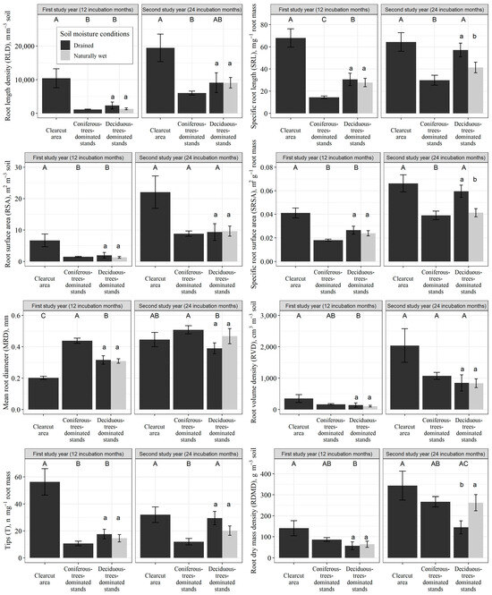 All fine root morphological traits tended to increase (mostly significantly, Table A1) with incubation time (1–2 years) in all separated groups of study sites (coniferous-tree-dominated stands, deciduous-tree-dominated stands, and clearcut area, Figure 2, Table A1) excluding fine root tip number on a dry mass basis (T) in studied clearcut areas (a significant decrease in the second study year was observed). Among groups of different stand development stages and types of dominant tree species, the highest values of most of the studied fine root morphological traits (RLD, SRL, RSA, SRSA, RVD, RDMD, T) were observed in clearcut areas in both the first and second study year (Figure 2). An exception was MRD for which the highest values were found in coniferous-tree-dominated stands. When comparing coniferous- and deciduous-tree-dominated stands under drained conditions, significantly higher mean values of SRL (both study years), SRSA, and T (second study year) were observed in deciduous-tree-dominated stands, while significantly higher mean values of MRD (both study years) and RDMD (second study year) were observed in coniferous-tree-dominated stands (Figure 2). In the group of deciduous-tree-dominated stands where stands with different soil drainage status were separated, significantly higher mean values of SRL and SRSA (second study year) were observed under the drained soil condition, while a significantly higher mean value of RDMD (second study year) was observed under the naturally wet soil condition (Figure 2). No significant differences in other studied fine root morphological traits between drained and naturally wet soil conditions in deciduous-tree-dominated stands were observed.