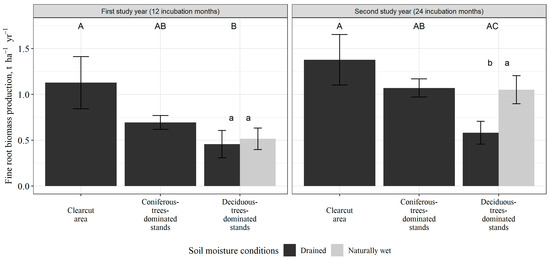 Annual fine root biomass production in stands dominated by coniferous trees, deciduous trees, and clearcut area (mean values ± S.E.; tree and understory vegetation roots combined). Annual fine root biomass production in the first and second study year (sampled 12 and 24 months after ingrowth core installation, respectively) is shown separately. Different capital letters denote significant differences (p < 0.05) between coniferous-tree-dominated stands, deciduous-tree-dominated stands, and clearcut area with drained organic soils (within each study year). Different lowercase letters denote significant differences (p < 0.05) between stands dominated by deciduous trees with drained and naturally wet organic soils (within each study year).