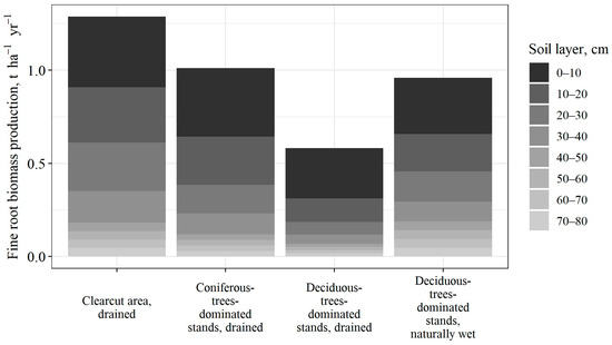 In the first study year, estimated mean annual fine root biomass production (Figure 3) ranged from 0.49 ± 0.09 t ha−1 yr−1 in deciduous-tree-dominated stands (stands with drained and naturally wet soils were combined as no significant difference was observed, p = 0.200) to 1.13 ± 0.29 t ha−1 yr−1 in the clearcut area (drained). Furthermore, the difference between mean annual fine root biomass production in deciduous-tree-dominated stands and the clearcut area was statistically significant (p = 0.017).