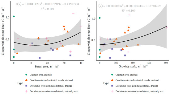 Correlation analyses between C input with fine root litter and different stand variables including and excluding clearcut areas were conducted separately. Only weak or no correlations (ρ < 0.315, p > 0.120) were found between annual C input with fine root litter in study sites (all study sites pooled including clearcut areas, results of the second study year were analyzed) and different stand variables (Table 1). Correlation analysis between annual C input with fine root litter in studied forest stands (clearcut areas were excluded from the analysis) and different stand variables (Table 1) revealed a moderate positive correlation between annual C input and growing stock (ρ = 0.413, p = 0.050), but only weak or no correlations (ρ < 0.350) were found between annual C input and other stand variables. The variation in annual C input with fine root litter (combining tree and understory vegetation roots) depending on stand basal area and growing stock (polynomial regressions) is shown in Figure 5 (clearcut areas included).