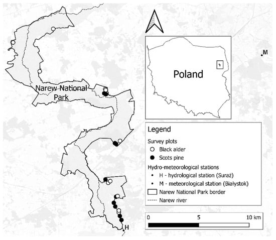 The vegetation of Narew National Park is shaped by the influence of river water [,], so it becomes important to answer the question of how changes in climate and water conditions will modify the growth of the park’s forests. The methods of dendrochronology and the responses to these changes recorded in the widths of the annual rings of the trees can help in describing the changes that have occurred in the past. The purpose of this study was to examine the response of Scots pine (Pinus silvestris L.) and black alder (Alnus glutinosa (L.) Gaertn.) to climatic and hydrological changes that have occurred over the past 50 years in Narew National Park. In particular, the decrease in the level of the Narew River, the increase in average air temperature, and changes in the distribution of total precipitation were tested. We assumed that the influence of the river water level on the growth of pine would be smaller than on the growth of alder, which will make it possible to compare the strength of climatic and hydrological factors on tree growth. The reaction of trees to changes in factors will allow us to assess the degree of threat to the park’s vegetation. Narew National Park was the optimal choice to conduct this type of research.