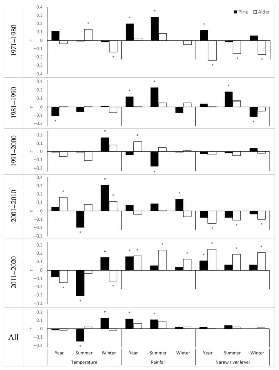 Pine responded more strongly to changes in air temperature and changes in precipitation, and alder to changes in river levels and changes in precipitation. Pine growth was favoured by warm winters, while it was limited by warm summers. Also, higher rainfall was correlated positively with a greater increase in pine thickness. River level was marginally correlated with radial growth in pine. It should be noted, however, that the autocorrelation analysis with a 1- to 5-year lag indicates that the pine response to changes in river level may occur with a one-year delay (Figure A5, Appendix A). Similarly, in alder, higher temperature interacted negatively and higher precipitation positively with tree growth. River water level was relatively strongly correlated with radial growth in alder, with the relationship taking negative values in the first decade (1971–1980, r = −0.24) and positive values in the last decade (2011–2020, r = 0.25); for the remaining decades, the correlation was low and not statistically significant. Despite significant correlations within selected decades, for the material as a whole, the alder ring width index did not correlate with the temperature, precipitation, and Narew River level indexes.