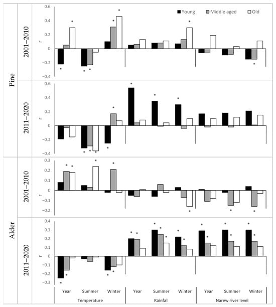 It was confirmed in studies that black alder, due to the environment of its occurrence, responds more strongly to changes in water levels and precipitation than changes in temperature [,] (Figure 2). Describing research also confirmed the results of Wilczynski [] according to whom pine increases radial growth in years characterised by warm winters and years with abundant summer precipitation. The analogous result of our work confirms Wilczynski’s conclusion that the response of pine to climatic conditions may be transregional. It is worth noting that Wilczynski’s research was conducted in the south-eastern part of Poland while our research was conducted in the northeastern part. However, can alder be used as an indicator of hydrological conditions and pine as an indicator of climatic conditions? According to our research, yes, provided that generational changes are taken into account. The results of our study showed that the younger generation of trees often reacted differently than the oldest generation, both to changes in climatic and hydrological conditions (Figure 3). An increase in summer temperature could generate a decrease in growth in the young generation of pines and an increase in growth in the old generation of pines. Similarly, in alder, a year with high river water levels could generate higher growth in the younger generation of trees and have no effect on growth in the older generation. The results obtained correspond with those of Au et al. [] on the effects of drought sensitivity of young and old trees across five continents. Their research showed that the response to drought of the young generation of trees is stronger than that of the older generation, but that the young generation regenerates more quickly after the drought subsides. Our research indicates that the response of the youngest generation of pines, both positive and negative, to changes in climatic conditions is usually stronger than that of the oldest generation. This occurs not only in pines, but also in alders in response to changes in fluctuations in river water levels and changes in air temperature. It should be noted that this phenomenon did not occur in decades characterised by favourable growth conditions. Given this, it may be a common phenomenon. This topic requires further research, especially in determining the reasons for the different response of trees of different ages to changes in climatic and hydrological conditions.