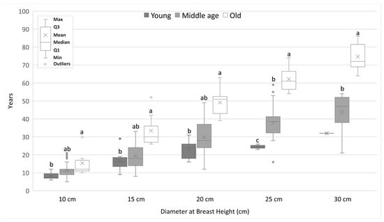 The average number of years needed to achieve a given DBH value for alder trees from different generations. Different lowercase letters of the alphabet next to the number of years indicate statistically significant differences between means at α = 0.05 (Kruskal–Wallis test with Bonferroni’s post hoc test).