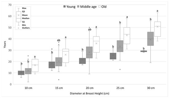 The average number of years needed to achieve a given DBH value for pine trees from different generations. Different lowercase letters of the alphabet next to the number of years indicate statistically significant differences between means at α = 0.05 (Kruskal–Wallis test with Bonferroni’s post hoc test or Mann–Whitney test for 30 cm DBH; only one pine reach DBH equal 30 cm).