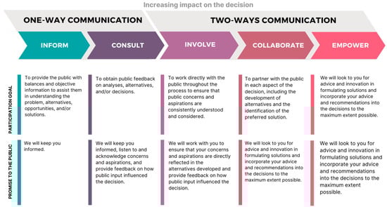 Spectrum of public participation, revised by the International Association for Public Participation (https://www.iap2.org/, accessed on 9 May 2024) [].