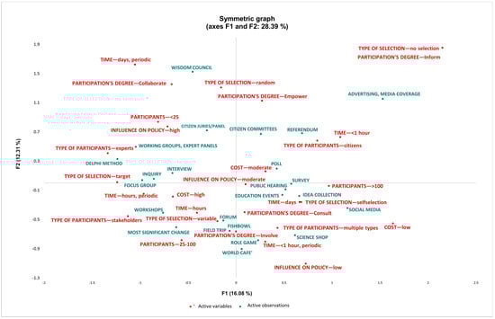 Observing the two axes, the results show for the first axis (F1) a contrast between the self-section of the participants (with positive values) and the target selection (with negative values). Self-selection is suitable for involving many participants (more than 100) in participatory techniques that do not require a specific target of participants (e.g., social media, surveys, and polls). Conversely, target selection is suitable for those participatory techniques that do not require a high number of participants, but the choice of participants is key to the success of the participatory process (e.g., Delphi method and focus group). For the second axis (F2), a contrast between the degree of participation “empower” (with positive values) and “involve” (with negative value) is highlighted. Empower the participants is a degree of involvement more typical of participatory techniques such as wisdom councils, while involve the participants is commonly used for participatory techniques such as world cafés and role games.
