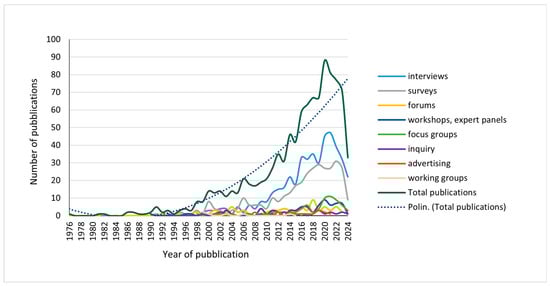 Interviews and surveys are the two most common participatory techniques used in forestry policies and strategies, followed by forums, workshops, and focus groups. These three techniques—although widespread—currently account for about 15%–20% of the first two, which are currently the most significant in the context of forest policies. The Delphi method, referendums, field trips, working and public groups, focus groups, and advertising are techniques that were widespread in the forest policy sector in the late 1990s and early 2000s. As shown in Table 3, techniques like social media, role games, and citizen committees have grown, especially in recent years, emphasizing the increasing complexity and diversification of research approaches.