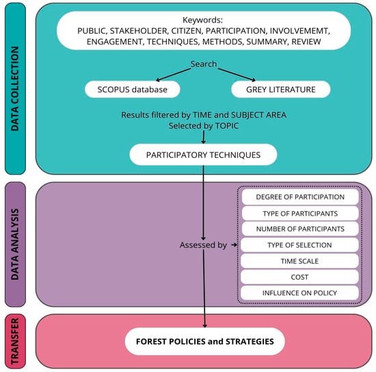 The study was structured in three steps in order to identify and analyse the participatory techniques used in different disciplinary sectors and evaluate their suitability in the forest-related decision-making process. The structure of the study is described in Scheme 1.