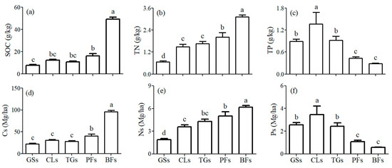 4.1. Responses of Soil C, N, and P Contents and Stocks to Forest Conversion