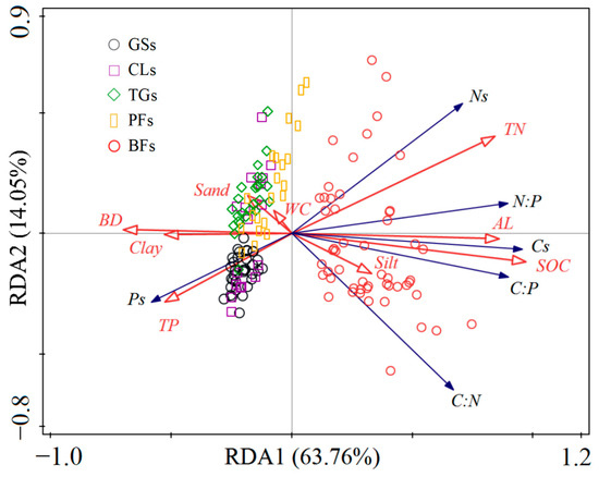 3.2. Variations in Soil C, N, and P Stoichiometry