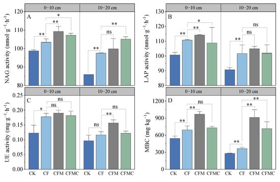 Effect of substituting chemical N fertilizers with organic alternatives on soil biological properties: (A) β-1, 4-N-acetyl-Glycosaminidase activity (NAG), (B) L-Leucine aminopeptidase activity (LAP), (C) urease activity (UE), and (D) microbial biomass carbon (MBC) in rubber plantations. CK, unfertilized as control; CF, chemical fertilizer application alone; CFM, the combination of 50% chemical N fertilizer and 50% co-composted organic N fertilizer application; CFMC, the combination of 50% chemical N fertilizer and 50% composted organic N fertilizer application. **, p < 0.01; *, p < 0.05; ns, p > 0.05.
