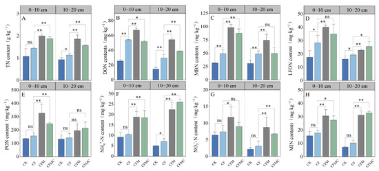 Effect of substituting chemical N fertilizers with organic alternatives on (A) total nitrogen (TN); (B) dissolved organic nitrogen (DON); (C) microbial biomass nitrogen (MBN); (D) light fraction organic nitrogen (LFON); (E) particulate organic nitrogen (PON); (F) ammonium nitrogen (NH4+-N); (G) nitrate nitrogen (NO3−-N); (H) mineral nitrogen (MIN). CK, unfertilized as control; CF, chemical fertilizer application alone; CFM, the combination of 50% chemical N fertilizer and 50% co-composted organic N fertilizer application; CFMC, the combination of 50% chemical N fertilizer and 50% composted organic N fertilizer application. **, p < 0.01; *, p < 0.05; ns, p > 0.05.