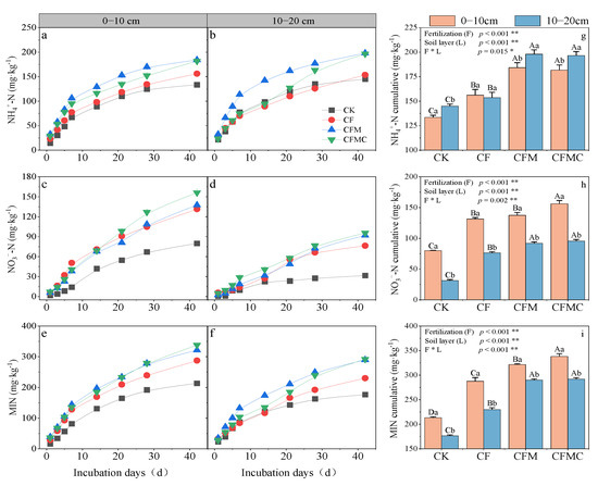 Effect of substituting chemical N fertilizers with organic alternatives on N mineralization characteristics (a–f) and accumulated inorganic N production after 6 weeks of incubation (g–i) of rubber plantations under four fertilization regimes. CK, unfertilized as control; CF, chemical fertilizer application alone; CFM, the combination of 50% chemical N fertilizer and 50% co-composted organic N fertilizer application; CFMC, the combination of 50% chemical N fertilizer and 50% composted organic N fertilizer application. Uppercase and lowercase letters signify significant differences (p < 0.05) in soil factors among four fertilization treatments within the same soil layer and between two soil layers for the same treatment, respectively. **, p < 0.01; *, p < 0.05.