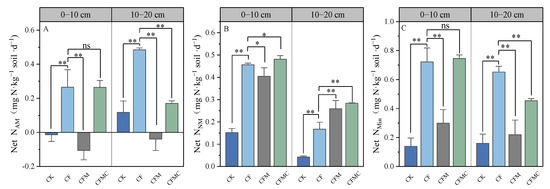 In this study, compared with CK treatment, the long-term fertilizer applications can stimulate soil net N transformation (except for net NAM), while all soil net N transformation parameters in the CFM and CFMC treatments were lower than those in CF treatment (Figure 4). These results indicate that the supply of nitrogen and the form of nitrogen are the key factors affecting the net soil N transformation. However, we unexpectedly found that the net ammonification rate (NAM) in the CFM treatment was significantly lower than that in other fertilization treatments and even lower than that in the CK treatment (Figure 4A). First, NH4+-N is an intermediate product of organic N mineralization and is affected by the activity of nitrifying bacteria in well-ventilated soils with moderate pH. Under such conditions, a significant enhancement in the activity of nitrifying bacteria leads to the simultaneous oxidation of the large amount of ammonium nitrogen produced by organic nitrogen mineralization to NO3−-N. Consequently, fewer intermediate products are accumulated in the soil [59]. Second, microbial nitrogen fixation is an important mechanism of soil nitrogen fixation [73]. The growth of soil microorganisms is more inclined to NH4+-N than to NO3−-N because the energy consumed by microbial cells to absorb NO3−-N is higher than the energy consumed to absorb NH4+-N [74]. Additionally, the soil nitrogen fixation rate is influenced by the soil microbial biomass, microbial diversity, and soil pH when the nitrogen content in the soil is adequate [75]. This study found that the application of organic fertilizer led to a significant increase in pH values in both soil layers compared with chemical fertilizer alone (Table 1). Despite receiving the same amount of nitrogen input, organic fertilizer not only supplied nitrogen but also other nutrients, creating a more favorable environment for microorganisms (e.g., MBC and MBN contents in the CFM and CFMC treatments were considerably greater than those in the CF treatment) (Figure 1D and Figure 2C). This promoted the oxidation and fixation of ammonium nitrogen, resulting in a significantly lower net ammonification rate in the CFM treatment than in the CF (Figure 4A).