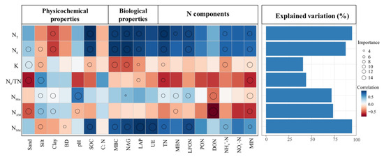 Contributions of soil physicochemical properties, biological properties, and N components to N mineralization parameters based on correlation and random forest model. Circle size represents the variables' importance (percentage of increase in mean square error calculated via random forest model). Colors represent Spearman correlations. Blue bars illustrate the cumulative contribution of environmental factors to nitrogen mineralization.