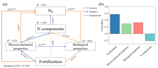 The PLS-PM identified direct and indirect fertilization treatments, soil physicochemical and biological properties, and N components on the mineralizable N potential (N0) (Figure 6). The SEM model showed that soil factors explained 91% of the variation in N0. The fertilization treatment (0.57), soil physicochemical (0.30), and biological properties (0.33) had a positive total effect on N0, while the N components (−0.21) showed a negative total effect on it (Figure 6b). Fertilization treatments were the major factor influencing the mineralizable N potential (Figure 6).