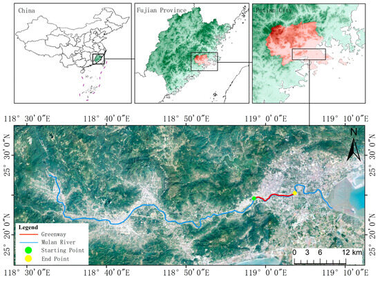 Putian is situated in Fujian, China, at coordinates ranging from 118°27′ to 119°39′ E, and 24°59′ to 25°46′ N. Putian has a subtropical oceanic monsoon climate with an average annual temperature ranging from 18 to 21 °C, an average annual sunshine duration of 1995.9 h, and an annual precipitation level between 1000 and 1800 mm. The Mulan River is recognized as the ancestral waterway of the Putian populace, rich in historical and cultural significance. It is one of the primary water systems in Fujian, with the primary Mulan River channel stretching over 168 km and covering a watershed area exceeding 2000 square kilometers [29]. The Mulan River greenway is established along the Mulan River, with a total length of approximately 10 km (Figure 1). The Mulan River greenway serves as an urban green corridor, providing urban residents with places for recreation, leisure, and physical activity.