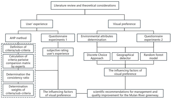 We employed the analytic hierarchy process method (AHP), questionnaire experiments, and an environmental attributes determination to reveal the influencing factors of users’ experience and visual preference. The research framework is depicted in Figure 2.