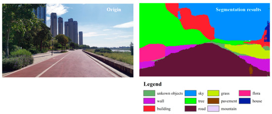 The environmental attributes determination was conducted in April 2022. The photos were taken in the morning on a sunny day. The data were collected at 100 m intervals, yielding a total of 96 sample plots in the Mulan River greenway from the beginning to the end (see Supplementary Figure S1). The pictures in each sample plot were taken at a horizontal level about 1.7 m above the ground by camera [7]. Semantic segmentation software utilizing a deep learning full convolutional network (FCN) trained on the ADE_20K dataset was employed to identify landscape elements [35]. With the help of semantic segmentation software, we were able to identify 150 environmental elements in pictures of sample plots (Figure 3). The percentage of environmental attributes in pictures was calculated using semantic segmentation software. The green view index (GVI) quantifies the percentage of pixels occupied by plant life (trees, shrubs, grasses, and flowers), while the blue view index (BVI) measures the proportion of pixels featuring bodies of water, such as rivers, lakes, oceans, and artificial water features, relative to the total pixel count in the image. Additionally, road (pavement), sky view factor (SVF), and building proportions were computed based on pixel ratios in each sample plot image. ColorImpact software v. 4.0.3 was utilized to extract colors occupying more than 5% of the image area. The number of colors and color areas were recorded using ColorImpact software. Color richness and color diversity were calculated according to Equations (1)–(3). The image was then imported into AutoCAD v. 2017 software to determine skyline dimensions with the assistance of Fractalyse 2.4 software.