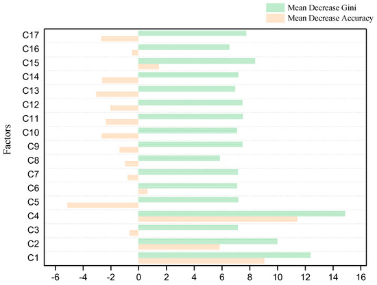 The highest accuracy of the random forest classification model was 62.54%. The main factors influencing users’ experience according to mean decrease accuracy and mean decrease Gini are site leveling (C4), plant landscape aesthetics (C1), air quality (C2), etc., (Figure 4). The site leveling, plant landscape aesthetics, and air quality have the greatest impact on the evaluation of green space users’ experience.