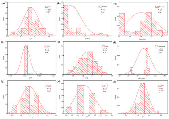The variety of environmental attributes. (a) GVI: green view index; (b) building; (c) pavement; (d) BVI: blue view index; (e) SVF: sky view factor; (f) dimension: the fractal dimension of skylines; (g) CD: color diversity; (h) CN: color richness; (i) SP: visual preference.
