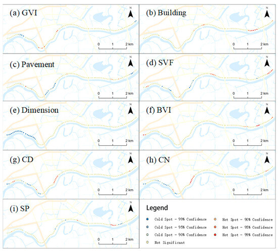 The hotspot of environmental attributes. (a) GVI: green view index; (b) building; (c) pavement; (d) SVF: sky view factor; (e) dimension: the fractal dimension of skylines; (f) BVI: blue view index; (g) CD: color diversity; (h) CN: color richness; (i) SP: visual preference.