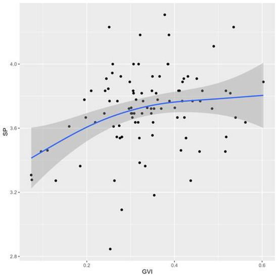 Scatter plot and Loess line of visual preference and the green view index. GVI: green view index; SP: visual preference; shaded areas over the dashed regression lines represent a 95% confidence interval for the fitted values of each model. The black dots represented sample point. Blue lines and gray shading represent fitted regressions and their bootstrapped 95% confidence intervals.