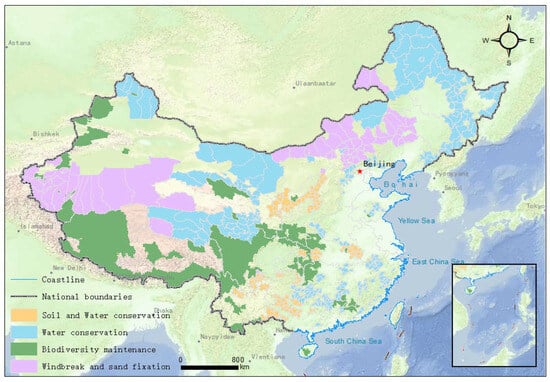 - Chen, H.; Hou, M.; Xi, Z.; Zhang, X.; Yao, S. Co-benefits of the National Key Ecological Function Areas in China for carbon sequestration and environmental quality. Front. Ecol. Evol. 2023, 11, 1093135. [Google Scholar] [CrossRef]