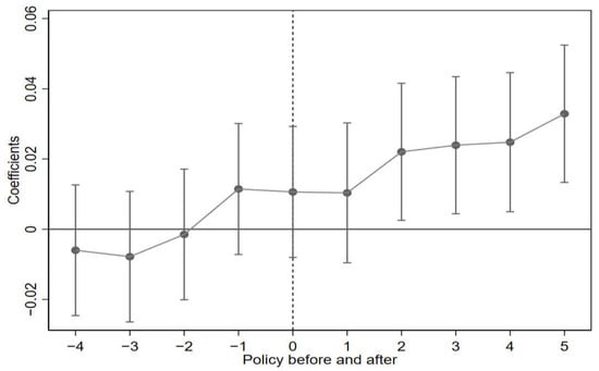 The important prerequisite for conducting the multi-period DID model is that the experimental and control groups have parallel trends before the policy is implemented. Referring to related studies [58,59], an event analysis is conducted to test whether there is a parallel trend in the policy. The test results are shown in Figure 3. The results showed that the estimated coefficients of the dummy variables in each year before the establishment of the national ecological functional area were not significant and fluctuated around 0, indicating that there was no significant difference in the resilience of the county economy between the experimental treatment group and the control group before the establishment, which satisfies the parallel trend hypothesis; After the establishment of the ecological functional area, the estimated coefficients of the dummy variables in each year were significantly positive, indicating that the establishment of the ecological functional area has a positive promoting effect on the resilience of the county economy, and this promotion role is increasing with the passage of time.