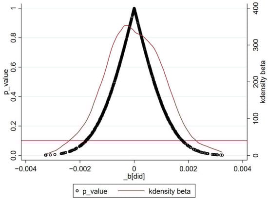 To ensure that the double difference method is not affected by unobserved factors, this study conducted non repetitive random sampling on all counties and policy times and constructed a virtual policy implementation time setting with a pseudo experimental group, a pseudo control group, and a pseudo policy impact time for placebo testing. As of 2021, there were a total of 346 counties belonging to the national key ecological functional areas. Therefore, 346 counties were randomly selected from 1256 counties without replacement as the pseudo experimental group, and the remaining samples were used as the pseudo control group. Subsequently, a random year was selected from 2007 to 2021 as the establishment time of a national key ecological function area, and a randomized experiment was constructed at the regional implementation time level. To further enhance the persuasiveness and explanatory power of the placebo test, the random process was repeated 1000 times to obtain the kernel density distribution map of the estimated coefficients under 1000 random policy shocks, as shown in Figure 4. The placebo test results showed that the mean estimated coefficient values of the fictional treatment group were 0, approximately following a standard normal distribution, and the p-values of most estimated coefficients were greater than 0.1. The estimated baseline regression coefficient is located at the right tail end of the placebo regression coefficient distribution. This indicates that the estimation results in this article were not obtained by chance and can exclude the influence of other policies or random factors. The results of the placebo test once again confirmed the true effectiveness of the policy effects on national key ecological functional areas.
