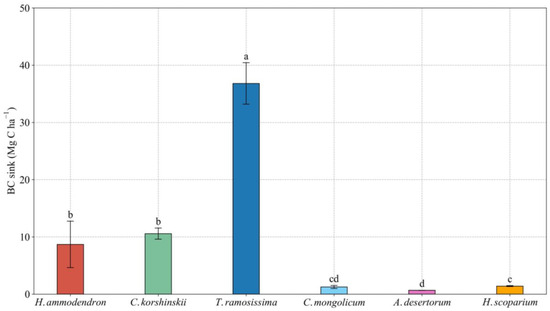 The BC sink of different sand-fixing plantations with a 25-year age was different (Figure 2). The BC sink of T. ramosissima was significantly higher than that of other sand-fixing plantations. The BC sequestration rate of T. ramosissima, H. ammodendron, C. korshinskii, H. scoparium, C. mongolicum and A. desertorum reached 1.47, 0.35, 0.42, 0.06, 0.05 and 0.03 Mg C ha−1·yr−1, respectively.