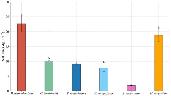 SOC sink of different sand-fixing plantations. Values are means ± standard deviations (SD, n = 9). Different lowercase letters denote significant differences among different sand-fixing plantations at the 0.05 level (p < 0.05).