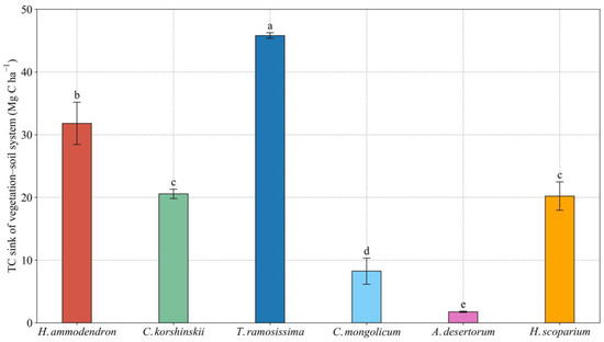TC sink of vegetation–soil system in the different sand-fixing plantations with 25-year age. Values are means ± standard deviations (SD, n = 9). Different lowercase letters denote significant differences among different sand-fixing plantations at the 0.05 level (p < 0.05).