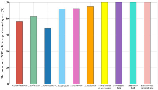 The proportion of SOC storage to TC storage of the different sand-fixing plantations was much lower than that in any of the unplanted controls and stable natural N. tangutorum shrubs, excepted for A. desertorum and H. scoparium (Figure 7). The proportion of SOC storage to TC storage was different among different plant species (Figure 7). That in the H. ammodendron and T. ramosissima plantations were significantly lower than that in the other sand-fixing plantations, reaching 76.44% and 68.02%, respectively.